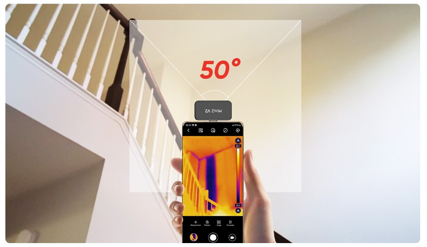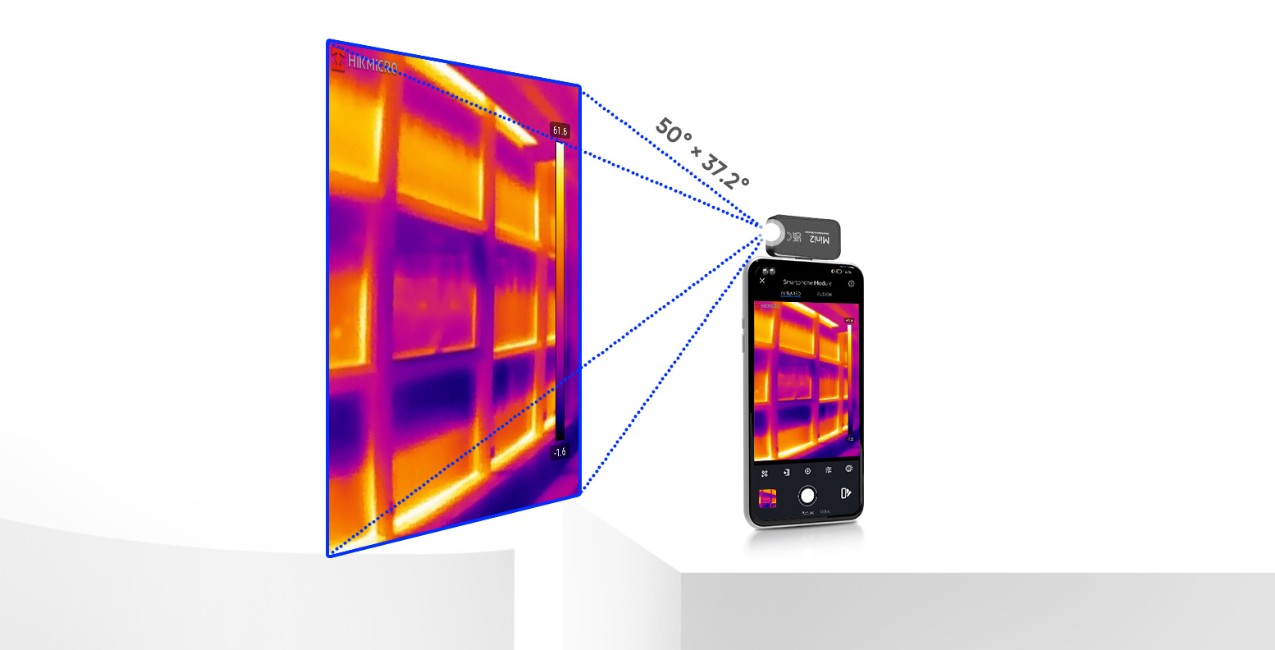 HIKMICRO Mini2 V2 con un obiettivo grandangolare da 50° offre un ampio FOV, ideale per la scansione di pareti, pavimenti e facciate per individuare problemi come perdite d’acqua, problemi di isolamento e infiltrazioni d’aria.
