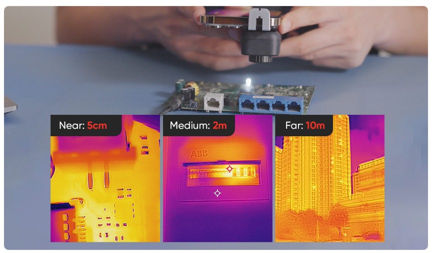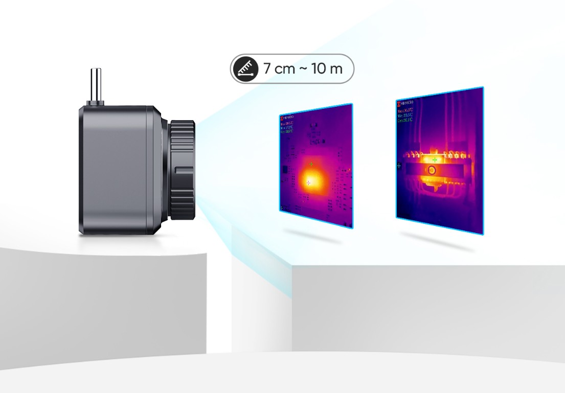 Dotato di un obiettivo con messa a fuoco manuale per l’ispezione a varie distanze, da 10 cm (0,23 ft) a 50 m (164 ft). Visualizzazione di piccoli oggetti come componenti elettronici fino a 0.5 mm o visualizzazione di oggetti più distanti come apparecchiature elettriche o meccaniche che richiedono una distanza di sicurezza.