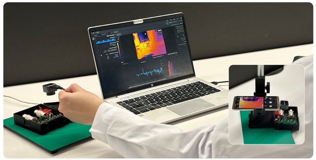 Il Mini2Plus V2, con il suo obiettivo a messa a fuoco manuale, è in grado di fornire viste stabili e dettagliate di oggetti di dimensioni fino a 340 micron, se utilizzato con una staffa aggiuntiva per il supporto da tavolo. Inoltre, è in grado di rilevare con precisione la temperatura di piccoli oggetti, come i componenti di circuiti stampati e assemblati.