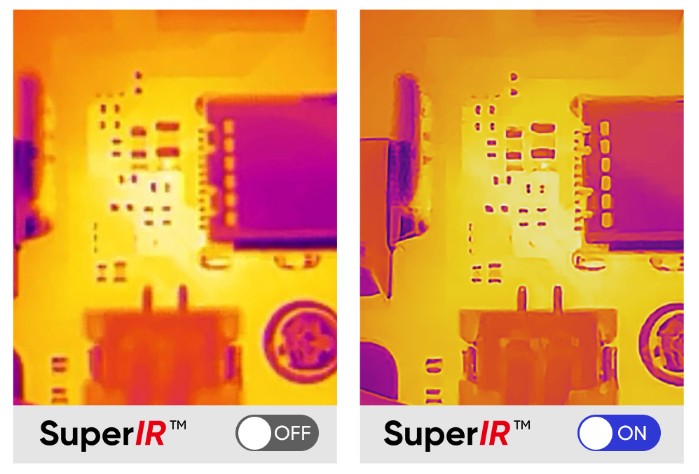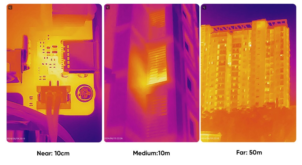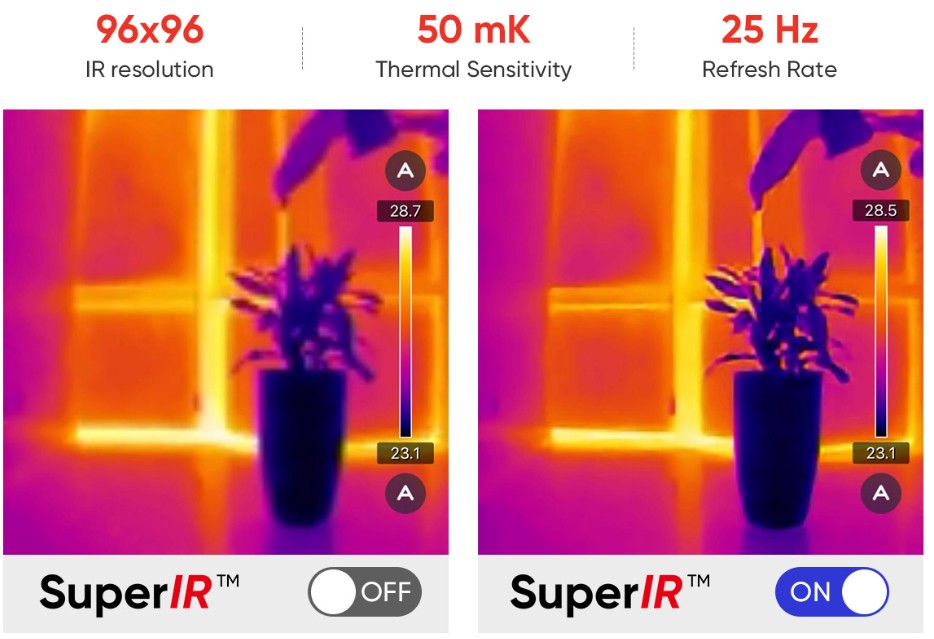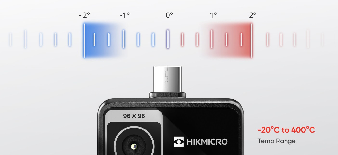 La fotocamera dispone di un rivelatore VOx altamente sensibile (NETD < 50 mK) con una risoluzione di 96 x 96 (92,16) pixel, insieme alla tecnologia avanzata di miglioramento dell’immagine HIKMICRO SuperIR per miglioramenti in tempo reale, riduzione del rumore e dettagli sui bordi migliorati.