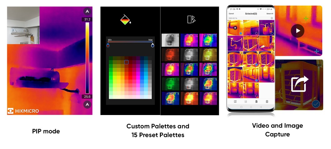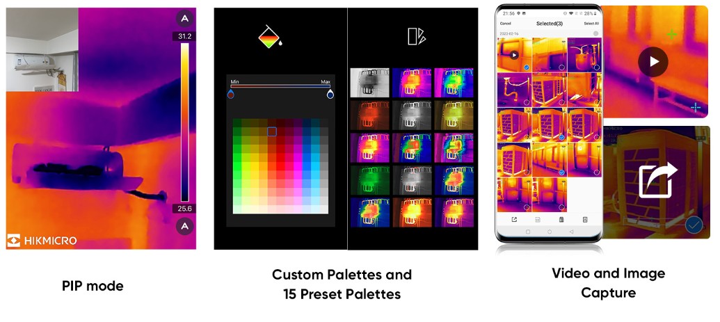 HIKMICRO MiniE con modalità PIP, tavolozze personalizzate e 15 tavolozze preimpostate, acquisizione di video e immagini facilita il lavoro.