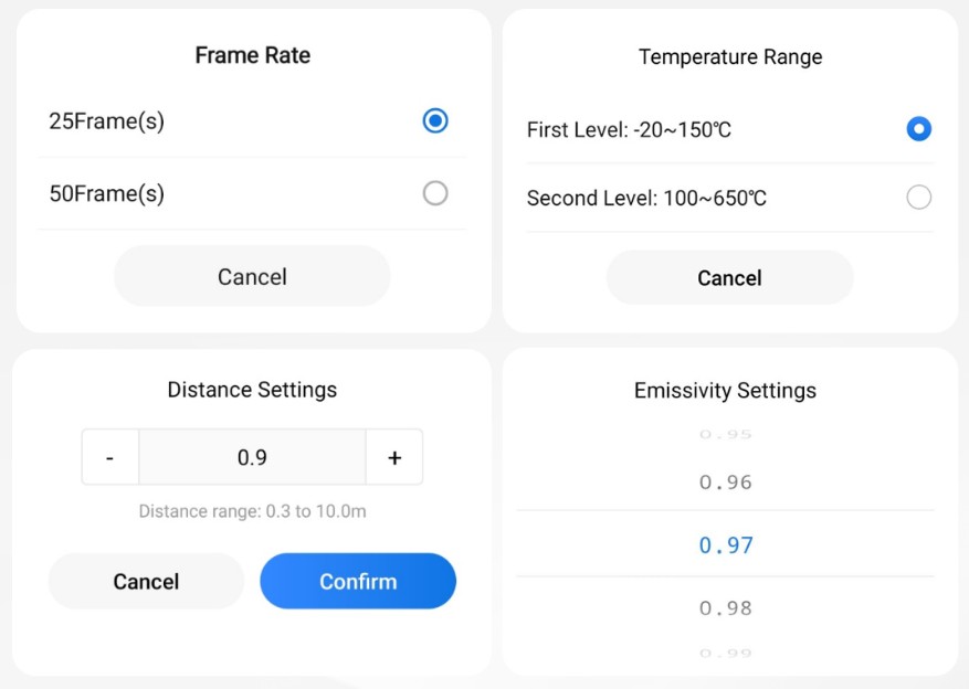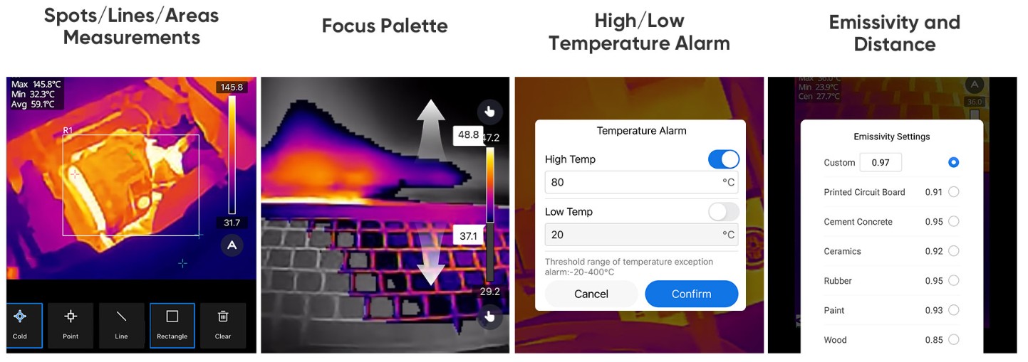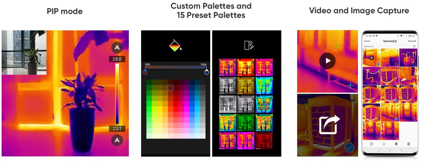 | Image Modes | Thermal, PIP | Thermal | Thermal | Thermal | Thermal, PIP | Thermal,Visual( with the phone camera) | Thermal/Visual/Fusion/PIP/Blending | - |